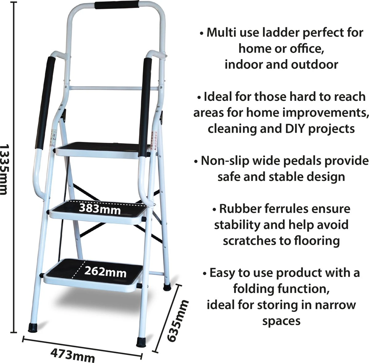 De opstapkruk met leuning is een veelzijdige opstap die zowel binnen als buiten kan worden gebruikt, ideaal voor schoonmaken, het uitvoeren van huisrenovaties, doe-het-zelf-klussen en het bereiken van moeilijk bereikbare plaatsen. Het opvouwbare ontwerp zorgt voor eenvoudige opslag en past op smalle plaatsen. Het lichtgewicht en dichte ontwerp zorgen voor gemakkelijk vervoer tijdens het gebruik. Deze trapladder heeft een veilig en stevig ontwerp. De antislip brede pedalen geven gebruikers een evenwichtig gevoel, en de rubberen hulzen beschermen uw vloer tegen krassen en verminderen de kans op uitglijden. De rubberen leuning zorgt voor extra grip. Verkrijgbaar als 2 of 3 treden model.